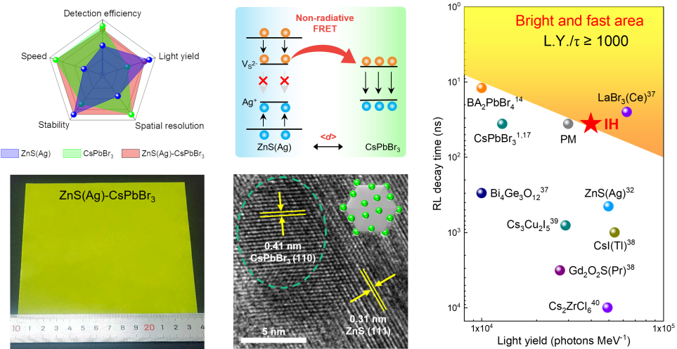 针对CsPbBr3QDs闪烁体光产额低、制备工艺兼容性差的问题,pp电子官方网站杨智、宋继中等设计了一种多位点ZnS(Ag)-CsPbBr3异质结,提出了原位固相合成策略制备异质结闪烁体。基于光谱匹配和短D-A距离特性,通过稳态RL光谱进化,瞬态吸收和瞬态PL谱证明了ZnS(Ag)给体到CsPbBr3受体发生了高效的福斯特共振能量转移(FRET),使得异质结闪烁体获得了光产额40,000 photons/ MeV,明显高于直接物理混合闪烁体的30,000 photons/MeV,证明了FRET导致的辐射增强可以在一定程度上弥补自吸收光损失。同时异质结闪烁体具有36 ns的快发光衰减时间和高的空间分辨率30 lp/mm。基于高光产额、快发光和高分辨成像的优势,异质结闪烁体展示了优异的高速动态X-ray成像性能,模拟了医学高速血管造影,在200帧/秒的速度和10 mGyairs−1剂量率下观察到11 cm/s的碘对比剂液流速度。该工作为设计和制造高性能异质闪烁体提供了新的方案,展示了兼具快和亮的闪烁体在实时X射线成像中的重要作用。