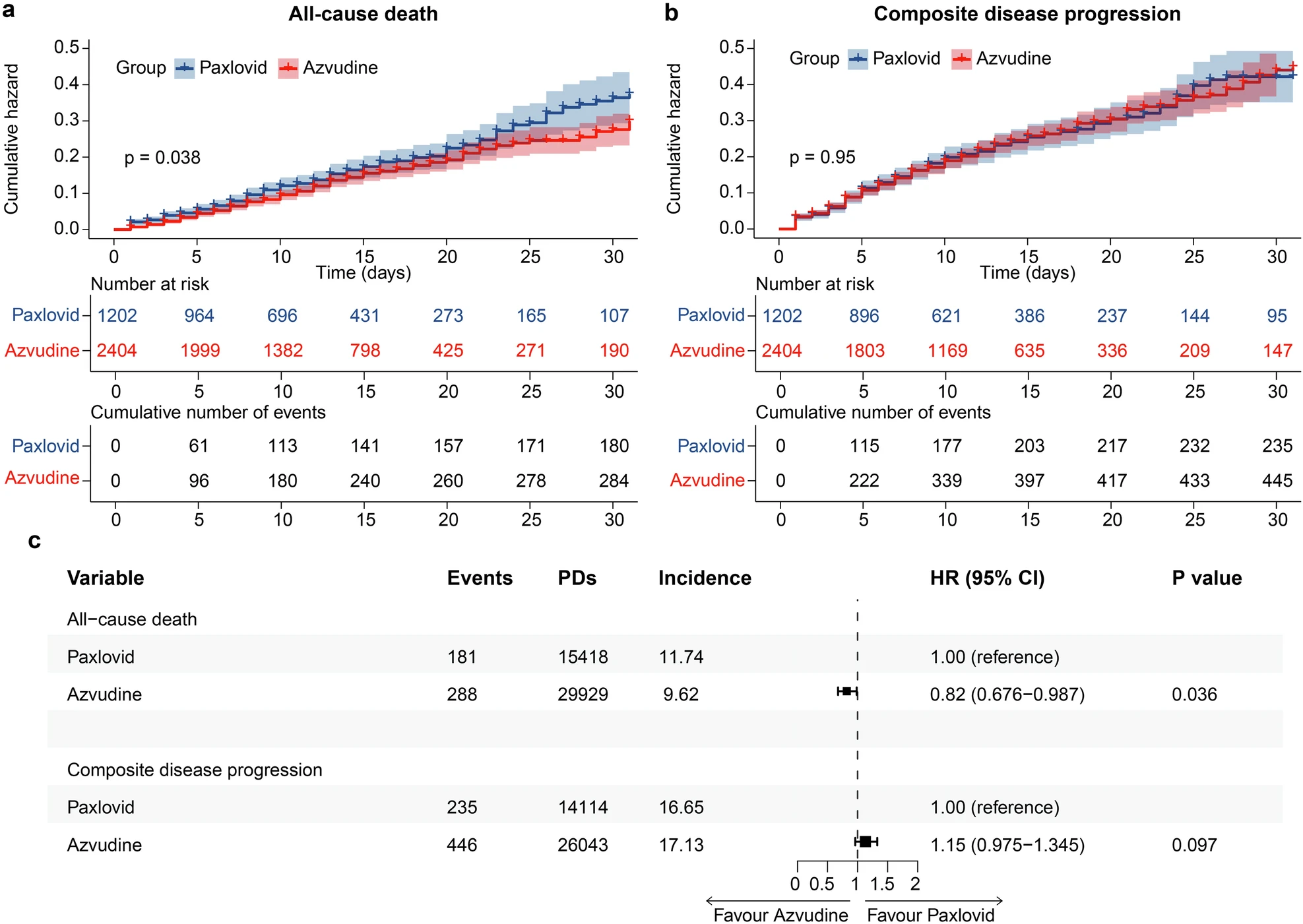 以“Real-world effectiveness and safety of oral azvudine versus nirmatrelvir‒ritonavir (Paxlovid) in hospitalized patients with COVID-19: a multicenter, retrospective, cohort study”为题的研究成果发表在Nature旗下顶尖期刊《Signal Transduction and Targeted Therapy》上。文章指出,奈玛特韦/利托那韦(Paxlovid)作为国际公认的新冠治疗药物,已在多项临床试验和真实世界研究中证实疗效,尤其是在降低住院率和死亡率方面表现突出。而Paxlovid的高成本、药物相互作用(如与CYP3A代谢药物的冲突)以及部分患者的不耐受性,限制了其广泛应用。阿兹夫定片作为一种价格更低、使用更方便的药物,与Paxlovid在有效性和安全性上相比如何呢?针对这一问题,余祖江教授团队开展阿兹夫定片与Paxlovid治疗新冠病毒感染的回顾性队列研究。该研究覆盖河南、新疆两省11家医院,共纳入40876例患者。结果显示:相比于Paxlovid组,阿兹夫定片组全因死亡风险显著降低18%(P=0.036),复合疾病进展风险无显著差异,且不良事件较少。亚组分析显示,阿兹夫定片为恶性肿瘤患者提供了更大的益处,能显著降低全因死亡风险(HR=0.33)和复合疾病进展风险(HR=0.54)。进一步通过体内外实验证实阿兹夫定片可以通过调节CD4⁺T和CD8⁺T细胞来抑制肝细胞癌生长。pp电子官方网站余祖江教授、任志刚主任医师与常俊标院士为通讯作者,王海宇博士生、崔光莹副主任医师、程铭高级工程师、新疆医科大学一附院吐尔干艾力·阿吉教授、洛阳市中心医院李国涛主任医师为共同第一作者。