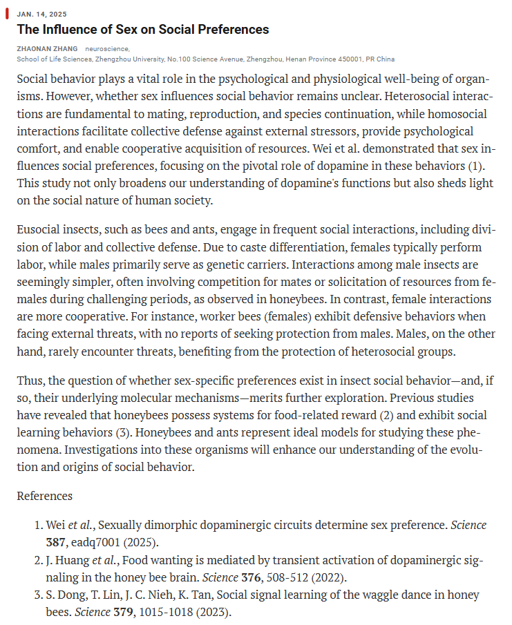 近日,pp电子官方网站生命科学学院张曌楠博士在国际著名学术期刊《Science》期刊网站的eLetters栏目上在线发表评述性论文“The Influence of Sex on Social Preferences”(JAN. 14, 2025)。结合近年来蜜蜂神经行为学和蜜蜂舞蹈行为学领域的新进展,文章对当期西安交通大学王昌河教授团队发表的Science论文“Sexually Dimorphic Dopaminergic Circuits Determine Sex Preference”的研究工作进行了评述,并对社会性昆虫蜜蜂的性别社交偏好进行了展望。