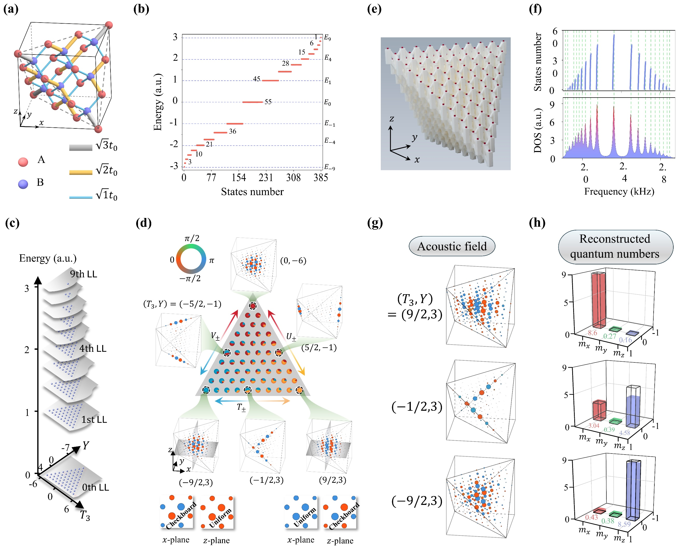 基于此,研究人员在三维金刚石声学晶格中实现了完全平坦和SU(3)量子数可分辨的朗道能级。在理论上设计了具有平方根耦合关系的应变金刚石结构[图1(a)],由应变产生的赝磁场导致了完全平坦的三维朗道能级,如图1(b)所示。此外,格点间的这种特殊的平方根耦合关系使得该紧束缚模型可以映射为一个四模Jaynes-Cummings模型。其固有的SU(3)对称性,可将每个朗道能级上的简并态用“超荷”Y和“同位旋”I这个两个SU(3)量子数进行分辨,使得图1(b)的能谱重构为图1(c)中的形式。由于能谱上的每个简并态的分布都具有SU(3)多重态的性质,因此,通过对每个态的波函数进行特征提取,可以得到其对应的SU(3)量子数,如图1(d)所示。最后,在实验上,研究人员利用3D打印技术构建了一个金刚石形状的四面体声学晶格[图1(e)]。晶格中的每个基本单元由两个声学腔和四对连接管组成,通过调节连接管的尺寸,实现了所需的非均匀平方根耦合。基于该精心设计的声学晶格,研究人员模拟了具有SU(3)对称性的量子自旋—玻色模型,首次在三维声学晶格中观测到了具有完全平坦能带的朗道能级,如图1(f)所示。另外,研究人员通过测量声压场的相位相关性,成功提取了SU(3)量子数,对三维平朗道能级上的特征模进行了可分辨测量,对应的声场分布如图1(g)和1(h)所示。这项研究为理解高维量子霍尔效应提供了新的视角,也为未来在人工平台上探索更高维度的量子霍尔效应开辟了新的途径。此外,该成果还可能对粒子物理的量子模拟产生重要影响,为研究夸克等基本粒子的行为提供了新的实验平台。