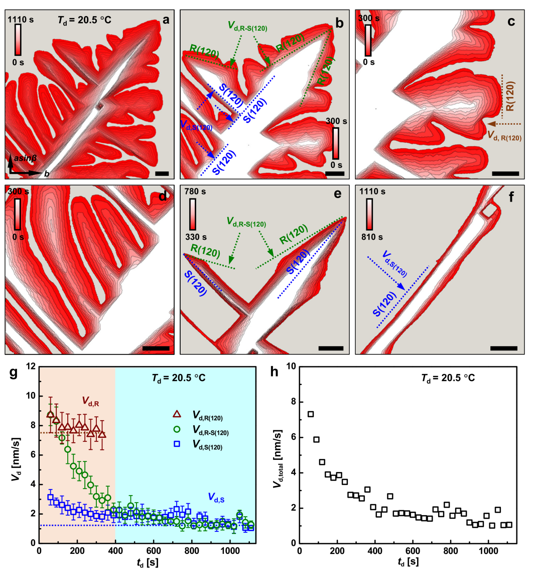 高分子晶体的溶解速率通常会随时间和空间而变化。研究团队以低分子量的聚氧化乙烯作为模型体系,采用分步选择性溶解的方法,揭示了高分子单晶亚稳性的空间变化在生长过程中是如何产生的。研究发现,沿着特定晶面的溶解速度是恒定的,但粗糙晶面的溶解速率大约是光滑晶面的5倍。溶解速率与熔融温度呈阿伦尼乌斯关系,由此可解析出粗糙晶面和光滑晶面的溶解活化能分别为420±40 kJ/mol和650±50 kJ/mol。这表明在粗糙晶面上分子链的相邻链数量大约比光滑晶面少三分之一。较高的溶解活化能表明对结晶高分子溶解而言,整条链的逐步解吸附是必不可少的。本研究不但揭示了聚合物晶体的生长动力学与其最终的亚稳性之间存在着紧密的联系,也有望为光刻胶加工物理、膜科学、塑料回收和药物输送等领域的研究提供新方法和新思路。