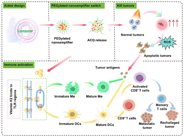 研究表明,利用光动力、光敏剂在特定激光照射下可以消除癌细胞,并触发全身免疫反应,这是肿瘤免疫治疗中的一种强大策略。但是,肿瘤抑制性免疫微环境,限制了光敏剂的疗效。为了弥补这种不足,研究团队首先通过计算模拟和实验验证,确定了维生素K2作为TLR激动剂的配体,可以有效激活包括树突状细胞(DCs)和巨噬细胞在内的抗原呈递细胞,并通过TLR途径促进它们的成熟。然后,再将维生素K2和焦脱镁叶绿酸a按照一定比例结合成纳米粒。另外,少许DSPE-PEG2000的加入使纳米粒具有更强的亲水性和稳定性。精心设计的纳米粒不仅具有按需释放PPA的能力,还可以通过释放维生素K2来激活巨噬细胞向M1型极化和促进DC细胞发育成熟,进而促进抗原呈递和CD8+ T细胞的激活,纳米药物在肝癌、乳腺癌等多种癌种中展示了显著的抗肿瘤效果。该研究表明,计算机辅助的自体佐剂治疗策略可作为癌症光免疫治疗一种有效方式。