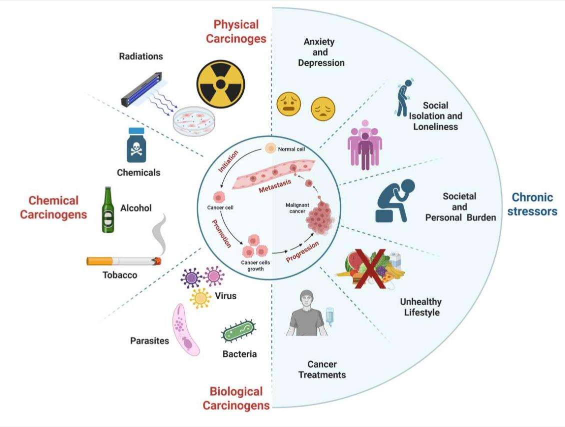 目前公认的癌症病因有三大类,物理、化学和生物致癌因素。物理致癌物包括电离辐射(IR)、紫外线(UV)辐射和其他形式的物理制剂;化学致癌物是直接诱导DNA损伤的化学制剂,如烟草、石棉、黄曲霉毒素、亚硝酸盐等;生物致癌物有HPV、EBV以及幽门螺杆菌(H.pylori)感染等。然而,这些致癌因素都是外源性的,宿主本身,特别是长期的慢性心理压力在癌症发生发展中的作用被长期忽视,尤其是在现代快节奏的生活和工作压力下,慢性压力和相关的负面情绪在癌症的研究中被高度重视。