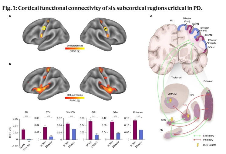中国帕金森病患者已超过500万,居全球首位。患者常表现出震颤、运动迟缓、肌肉僵硬等症状,其治疗面临诸多挑战:药物治疗易产生耐药及并发症,脑深部电刺激虽是一项成熟有效的疗法,但因其成本高昂、需要手术植入电极等问题,在国内的普及率仅为1%。王梅云教授深耕脑疾病影像诊疗领域三十年,在大陆地区率先开展了帕金森震颤的磁共振引导下聚焦超声(磁波刀)无创治疗,治疗震颤效果立竿见影,取得了很大反响。通过与昌平实验室刘河生教授团队合作,对超过800例临床影像数据的分析中发现,帕金森病并非简单的局部受损,而是一个大规模网络的功能失调,帕金森病患者大脑皮层的SCAN网络与基底节、丘脑等深部核团之间存在病态的“强连接”,这种过度连接干扰了运动规划与协调,导致了患者动作迟缓、震颤及认知功能受损。研究证实,无论是现有的药物治疗、脑深部电刺激治疗,还是磁波刀治疗、经颅磁刺激神经调控治疗,本质上都可以通过调控这一环路的病态连接来改善症状。