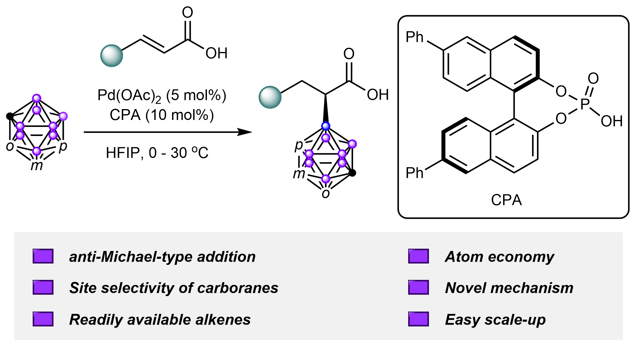 近日,pp电子官方网站化学学院在碳硼烷不对称B-H键活化研究领域取得积极进展。该研究利用钯/手性磷酸协同催化策略,创新性地实现了碳硼烷对α,β-不饱和羧酸的不对称反Michael加成,即碳硼烷加成在了羧基的α位。