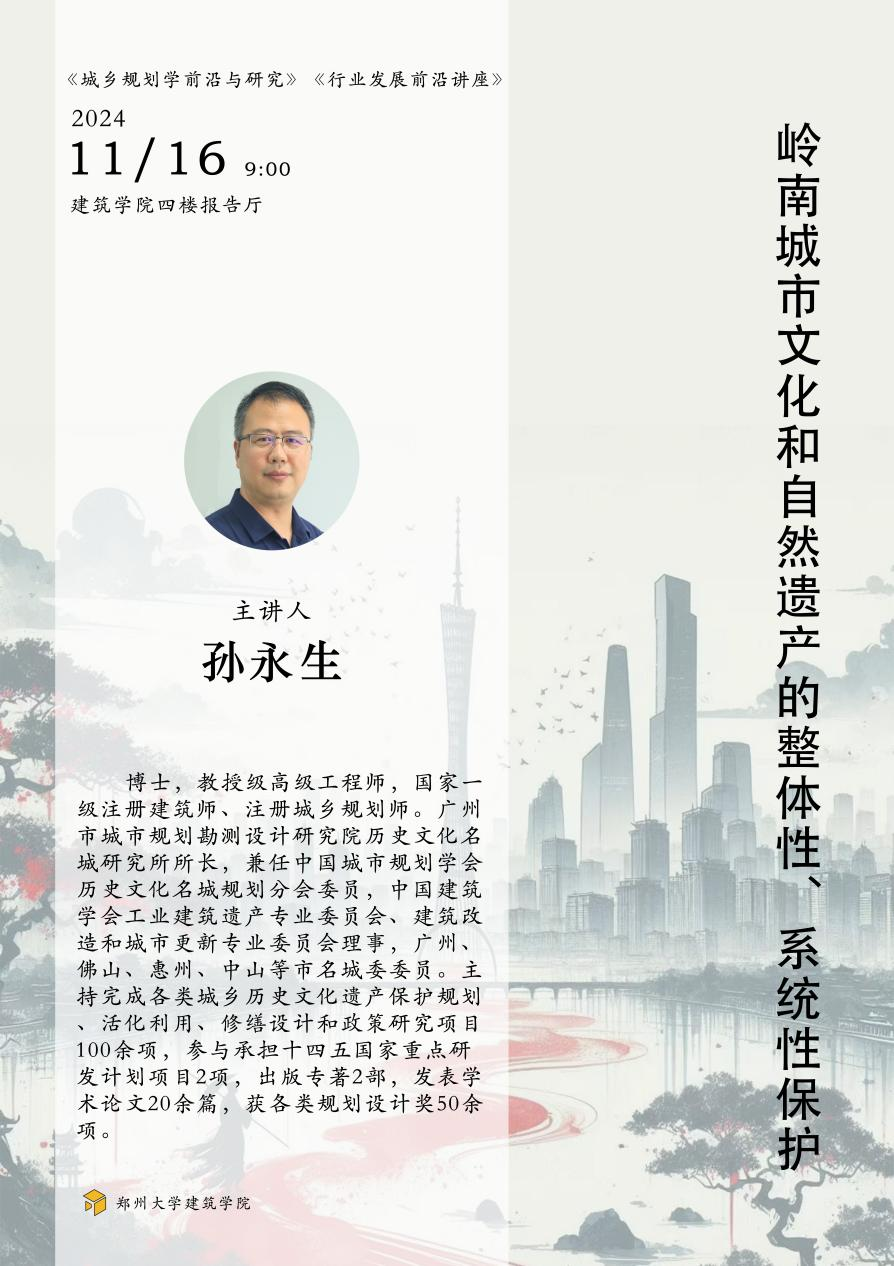 为提升城乡规划与建筑学研究生的专业素养,关注城乡发展和文化遗产保护的前沿问题,pp电子官方网站建筑学院特邀广州市城市规划勘测设计研究院历史文化名城研究所所长孙永生开展“岭南城市文化和自然遗产的整体性、系统性保护“讲座,就岭南地区历史变迁与流域保护,山水名城传承与城市风貌塑造,历史水系修复与沿线街区保护更新等内容进行分享,敬请各位师生莅临。