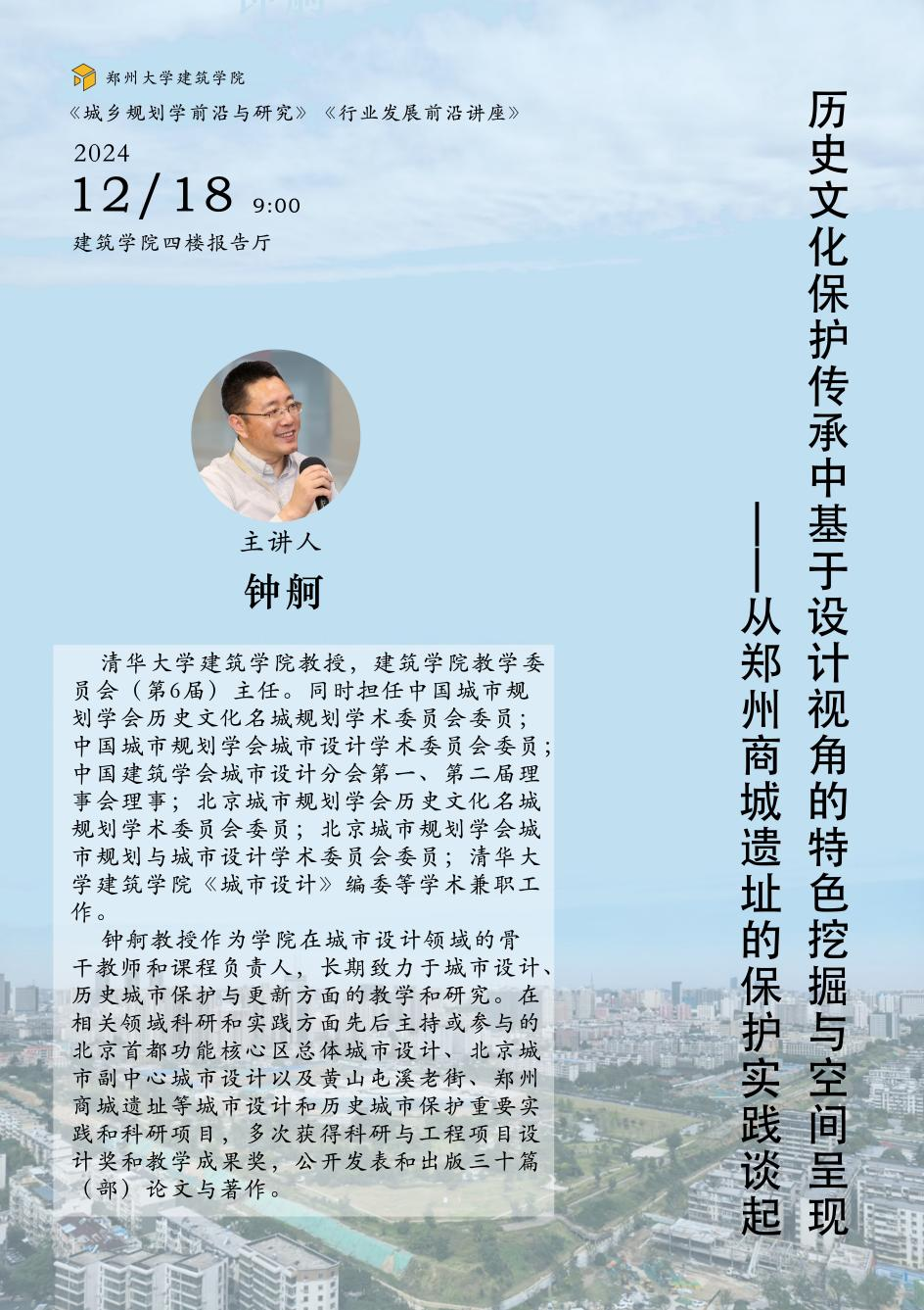 在对历史文化保护传承日趋重视的背景下,为促进学术交流与经验分享,提升城乡规划与建筑学研究生的专业素养,pp电子官方网站建筑学院特邀清华大学建筑学院钟舸教授展开“历史文化保护传承中基于设计视角的特色挖掘与空间呈现——从郑州商城遗址的保护实践谈起”讲座。通过深入剖析郑州商城遗址保护项目实践中的设计理念、特色挖掘方法以及空间呈现策略,为大家在历史文化保护传承领域的工作提供思路与借鉴,敬请各位师生莅临。