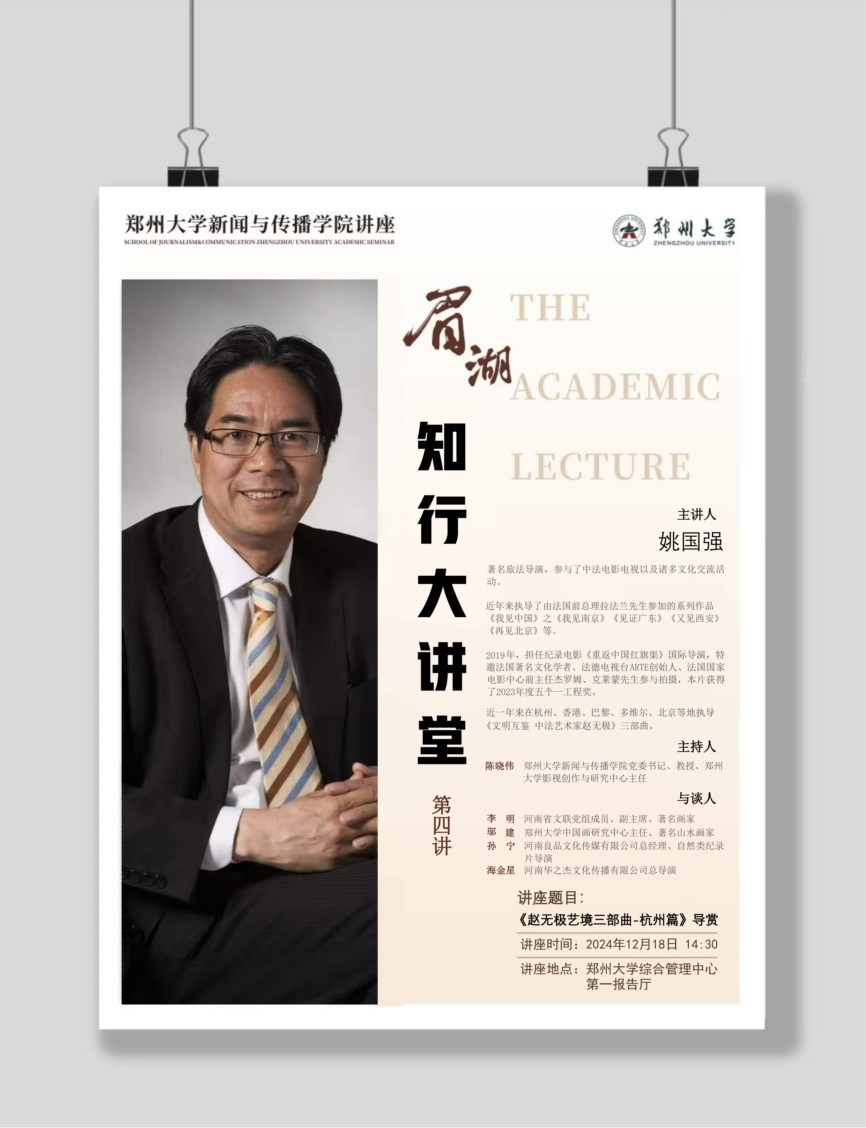 pp电子官方网站新闻与传播学院眉湖·知行大讲堂是一个汇集知识、人文、艺术于一体的交流平台,定位以文化人,审美向善。第四期邀请了著名旅法导演姚国强先生携纪录片作品《赵无极艺境三部曲》前来交流并做现场导赏,欢迎广大师生积极参加!