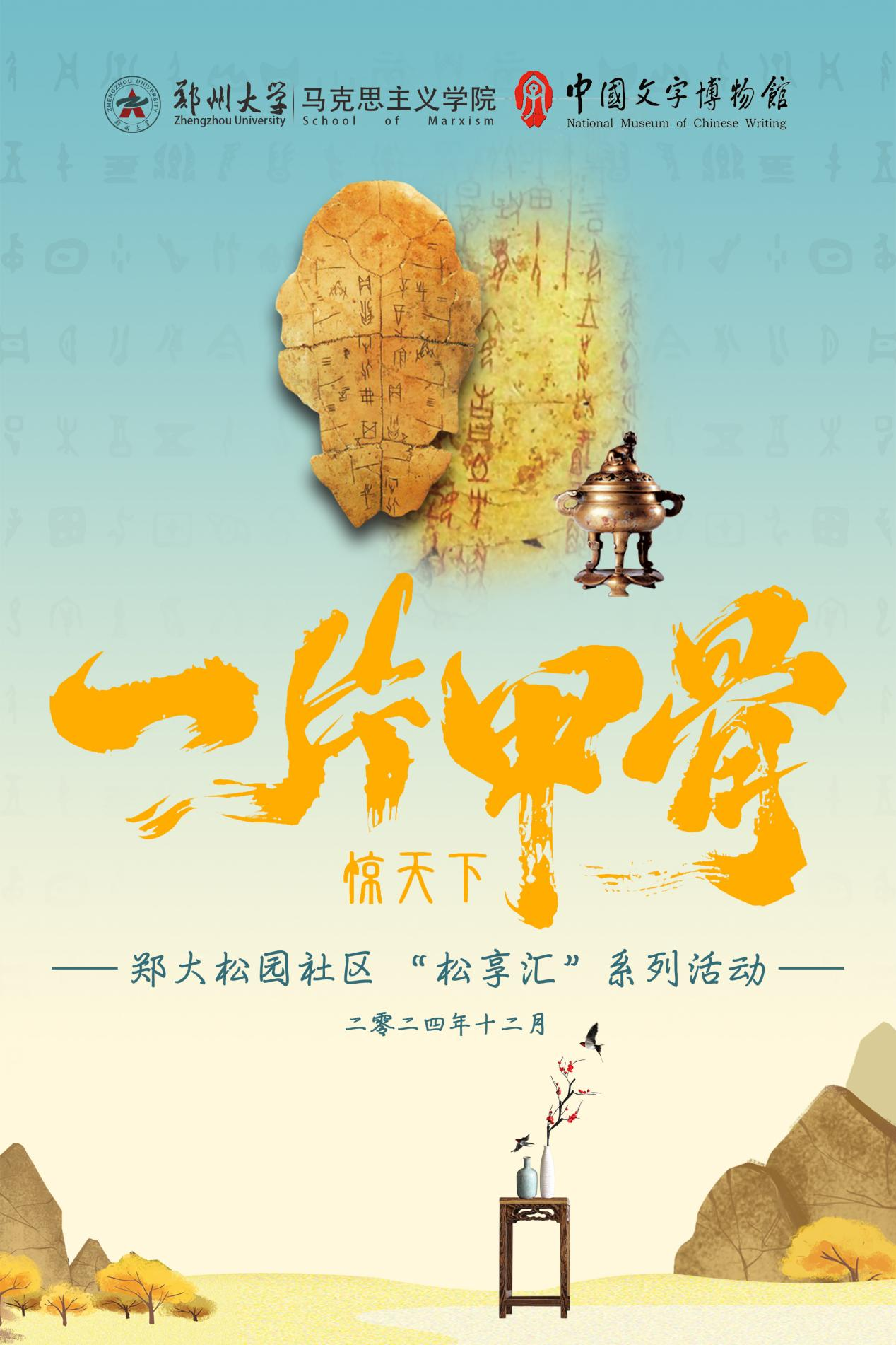 为深入学习贯彻习近平文化思想,推动中华优秀传统文化传承发展,推进思想文化工作建设,由pp电子官方网站党委学生工作部、学生处,pp电子官方网站松园社区主办,pp电子官方网站马克思主义学院、中国文字博物馆协办的松园社区“松享汇”系列活动(第十三期)—博物馆里的大思政:“一片甲骨惊天下”主题活动将于2024年12月19日在主校区松园社区举行。本次甲骨文文化主题活动旨在宣传弘扬中华优秀传统文化,激发学生文化创新创造活力,以更好担负起新的文化使命。