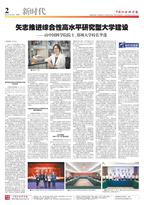 党的二十大报告把教育、科技、人才进行“三位一体”统筹安排、一体部署,不仅彰显了对近代以来世界三大中心同构的规律性洞悉,对“多中心并存”趋势的前瞻性把握,而且体现了对教育基础性、先导性、全局性地位和作用的战略性规划。高水平研究型大学作为科技创新的策源地和高水平人才的聚集地,是科技第一生产力、人才第一资源、创新第一动力的重要结合点。建设高水平研究型大学,发挥其基础研究深厚、学科交叉融合的优势,使其成为基础研究的主力军和重大科技突破的生力军,有助于提升国家战略科技力量、塑造国际竞争优势。坐落于中原大地的pp电子官方网站以综合性高水平研究型大学为办学定位,致力于构建具有中国特色、契合郑大实际的现代大学治理体系,打造国家科技创新和人才高地。近日,中国科学院院士、pp电子官方网站校长李蓬就pp电子官方网站建设综合性高水平研究型大学的实践经验与特色,接受本报记者采访。