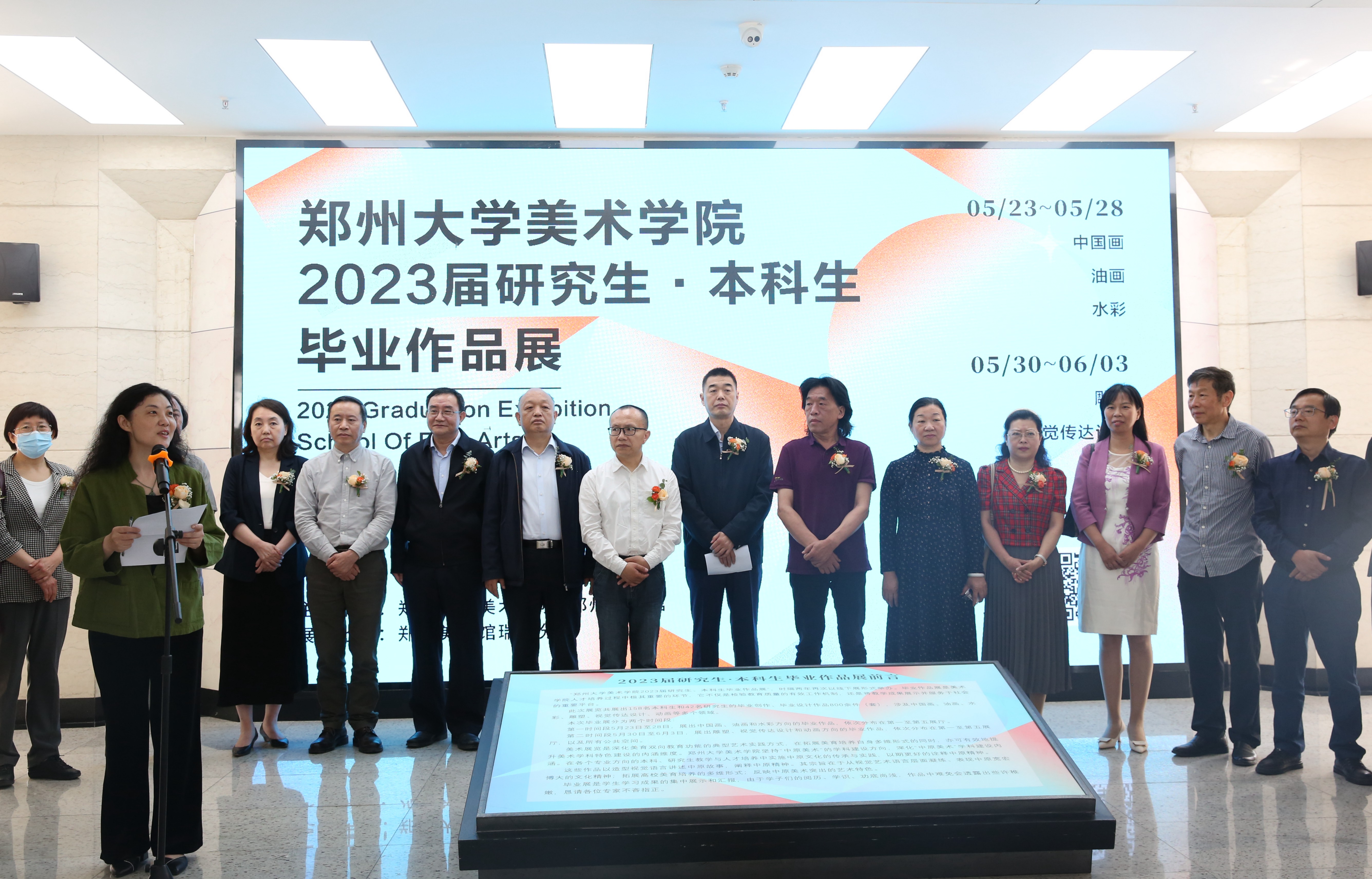于会见点评分析了毕业生作品中的创作理念和形式语言,河南大学美术学院院长席卫权代表省内美术教育界祝贺毕业展开幕,美术学院教师代表李意淳教授、2023届毕业生代表孔昕格同学分别发言。许东升宣布毕业展正式开幕。