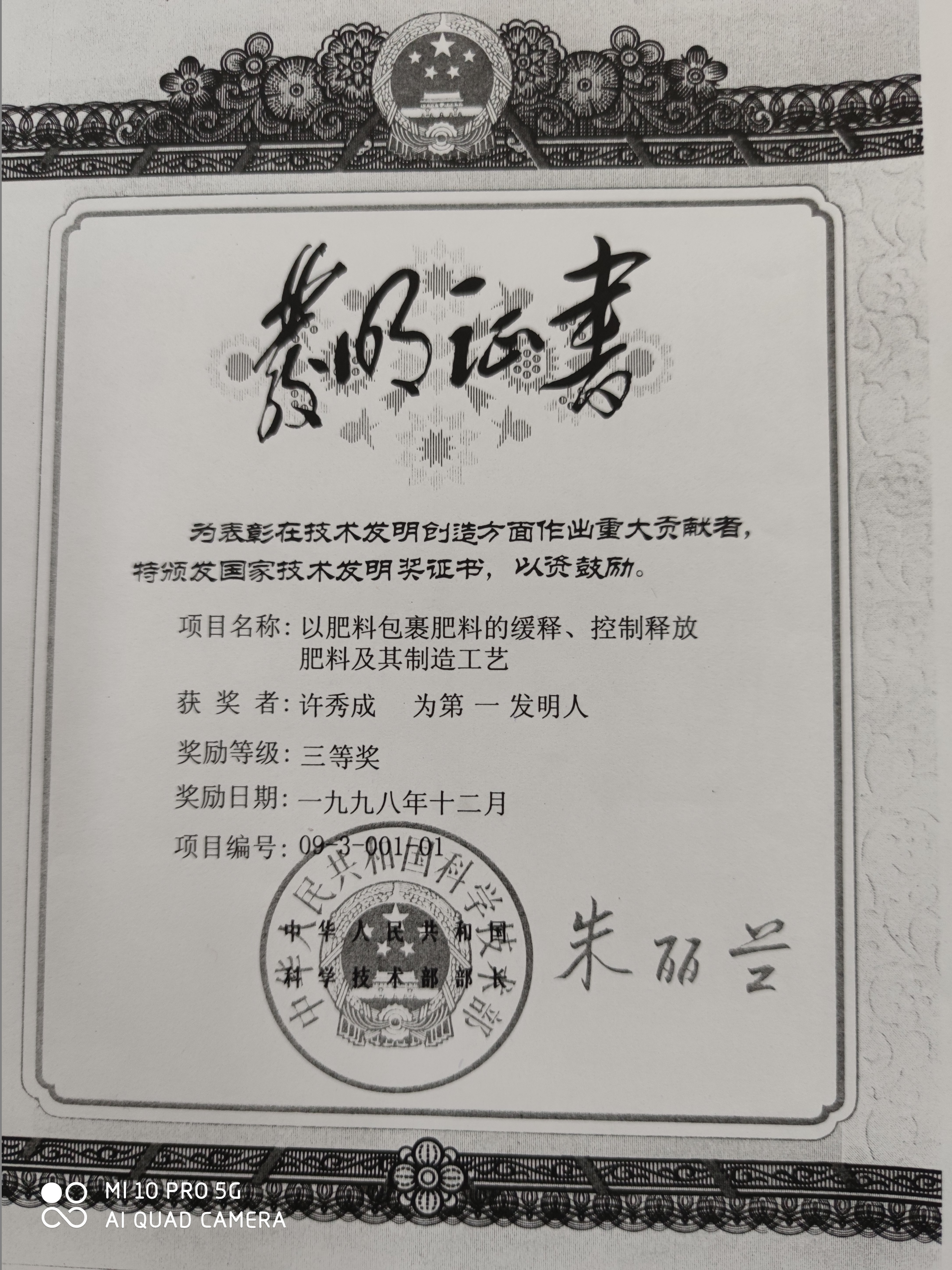 1998年,新型控制释放肥料获国家技术发明奖三等奖,是中国首创的世界上第一个有使用价值的控制释放肥料,在国际领域被誉为“控制释放肥料的革命性突破”,其注册品牌Luxacote(乐喜施)被列为世界控释肥料家族的著名品牌之一。