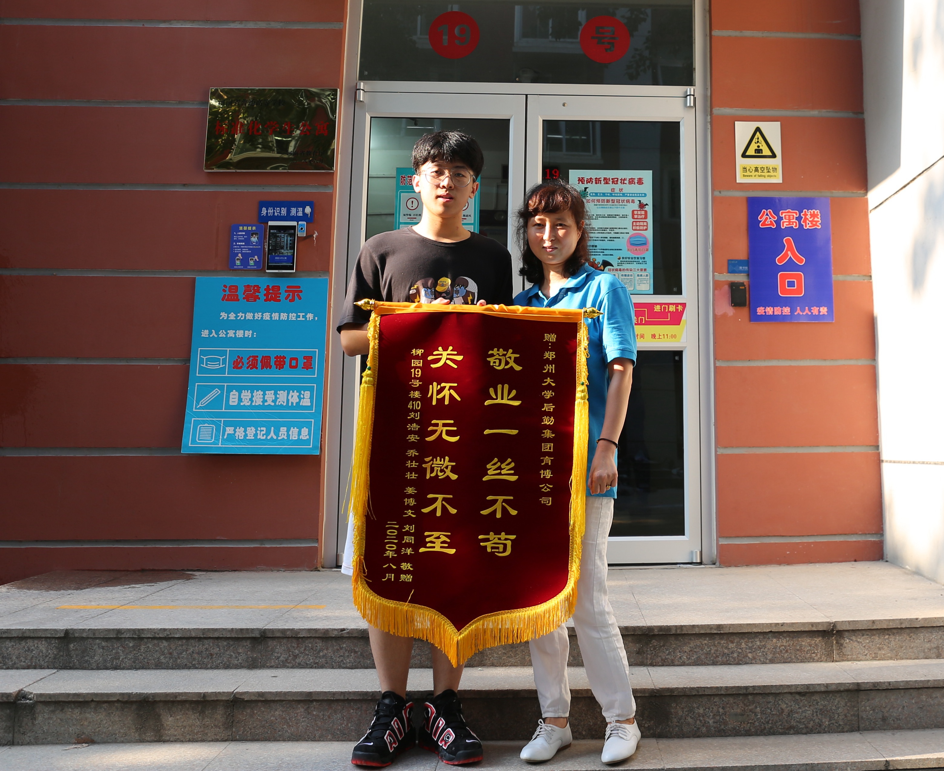 8月27日,机械与动力工程学院2019级学生刘浩安带着行李回到了暂别7个多月的校园。在他的行李箱中除了衣服、书籍外,还有一件特殊的物品——一面写有“敬业一丝不苟 关怀无微不至”锦旗。刘浩安作为宿舍第一个到校的同学,一进宿舍门就迫不及待地将早已准备好的锦旗送给了柳园19号宿舍楼的值班员李艳丽,对其表达感激之情。刘浩安说:“疫情期间,阿姨们坚守岗位,对每个宿舍房间进行打扫、通风、消毒,还帮同学们晒被子。特别是当李阿姨得知我容易过敏后,利用周末休息时间,将我们宿舍四个人的床单、被罩等床上用品进行了清洗,晾晒干后又帮忙重新铺到了床上,这让我十分感动,真心感谢李阿姨。”