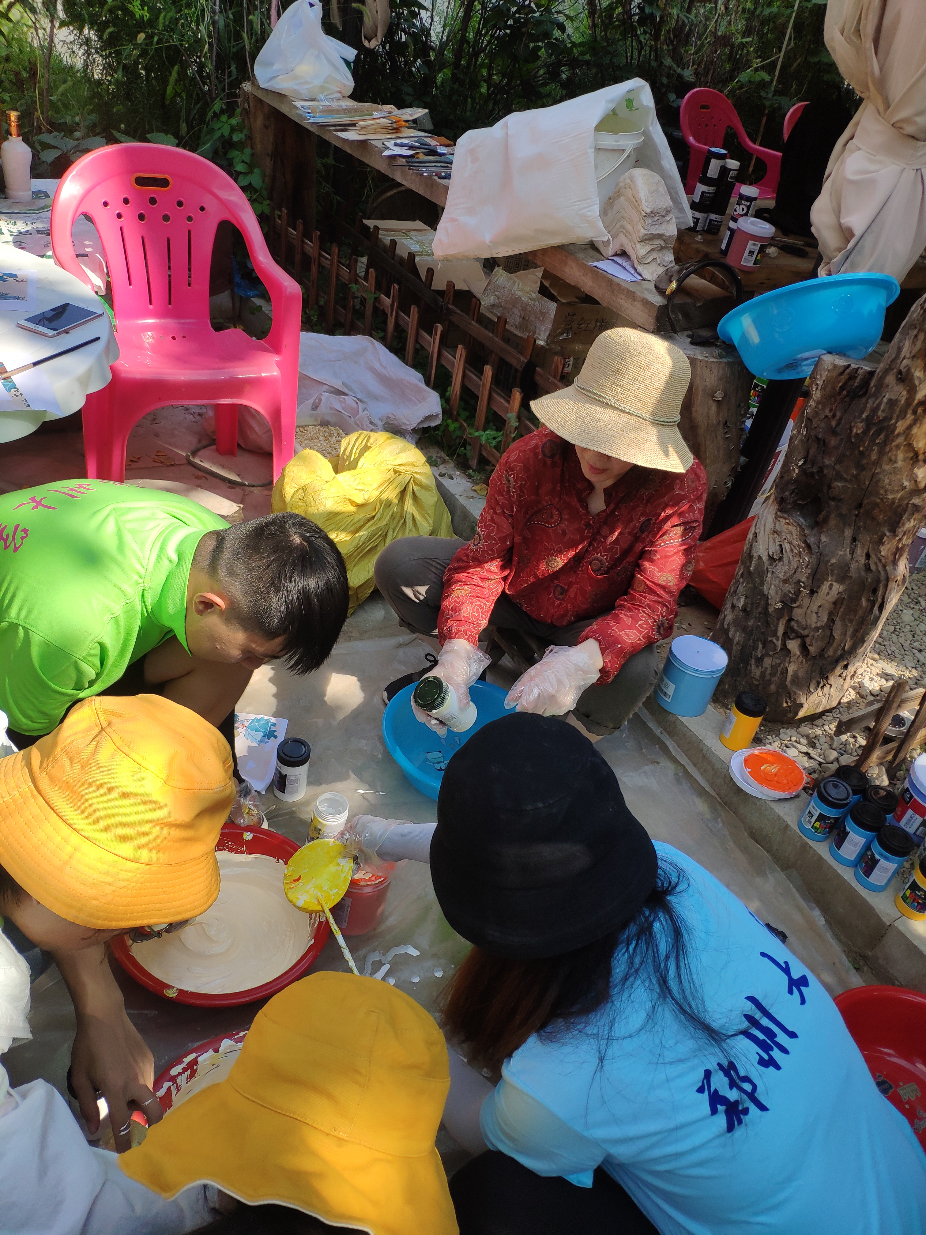 户外工作的几日正是一年中最热的时候,湿热的空气和不断飞来的蚊虫是团队进行室外墙绘的严重干扰。连续几天和学生一起进行墙绘工作,油画系的张博老师晒得黝黑,额头上不时渗出细密的汗珠,而他从未放下手中的笔刷。薛峰老师时时刻刻往身上涂风油精,白皙的肌肤上,腿上满满都是蚊虫叮咬留下的痕迹。