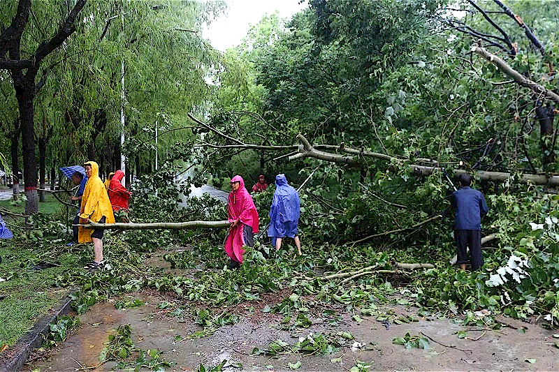 20日下午,冒着倾盆大雨,员工们挥舞着斧头及时处理影响道路的树木,并及时排查校内所有区域的窨井,疏通被垃圾堵塞的井盖,防止污水外冒,保障下水通畅。“在排查过程中发现,主校区中核心教学楼附近一处窨井盖被冲走,这个路段来往师生较多,相当危险,员工们及时处理,并搬来两辆自行车作为警示。”一位受访者说。