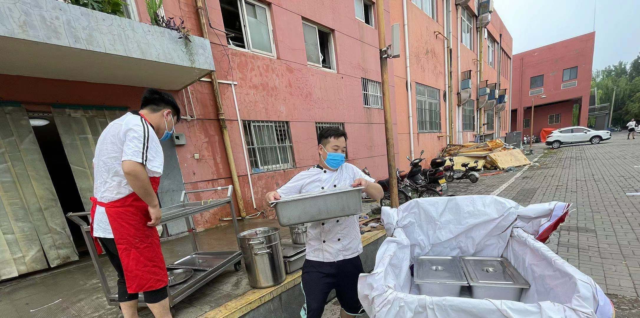 学校正处于小学期,主校区在校生有1.2万人,洪水之下停水停电,如何让学生们吃上热气腾腾的饭菜?这成为饮食部门急需破解的重点难点问题。据后勤集团饮食部门的负责人王雷介绍,菊园地势低、积水深,餐厅进水严重。当时没有备用的防汛袋,员工只能用米和面粉进行围堵,但水还是止不住从下水道翻出来。食堂的高压电已经断开,王雷交代员工关闭所有的阀门,包括燃气阀、水阀、电阀,以防止发生意外。随后员工们一起将绞肉机等小型机器搬至较高的地方。水势较猛,一些冰箱、冰柜等大型机器在水进来时被冲倒,王雷说:“即使扶起来,里面的压缩机也可能无法工作。”
