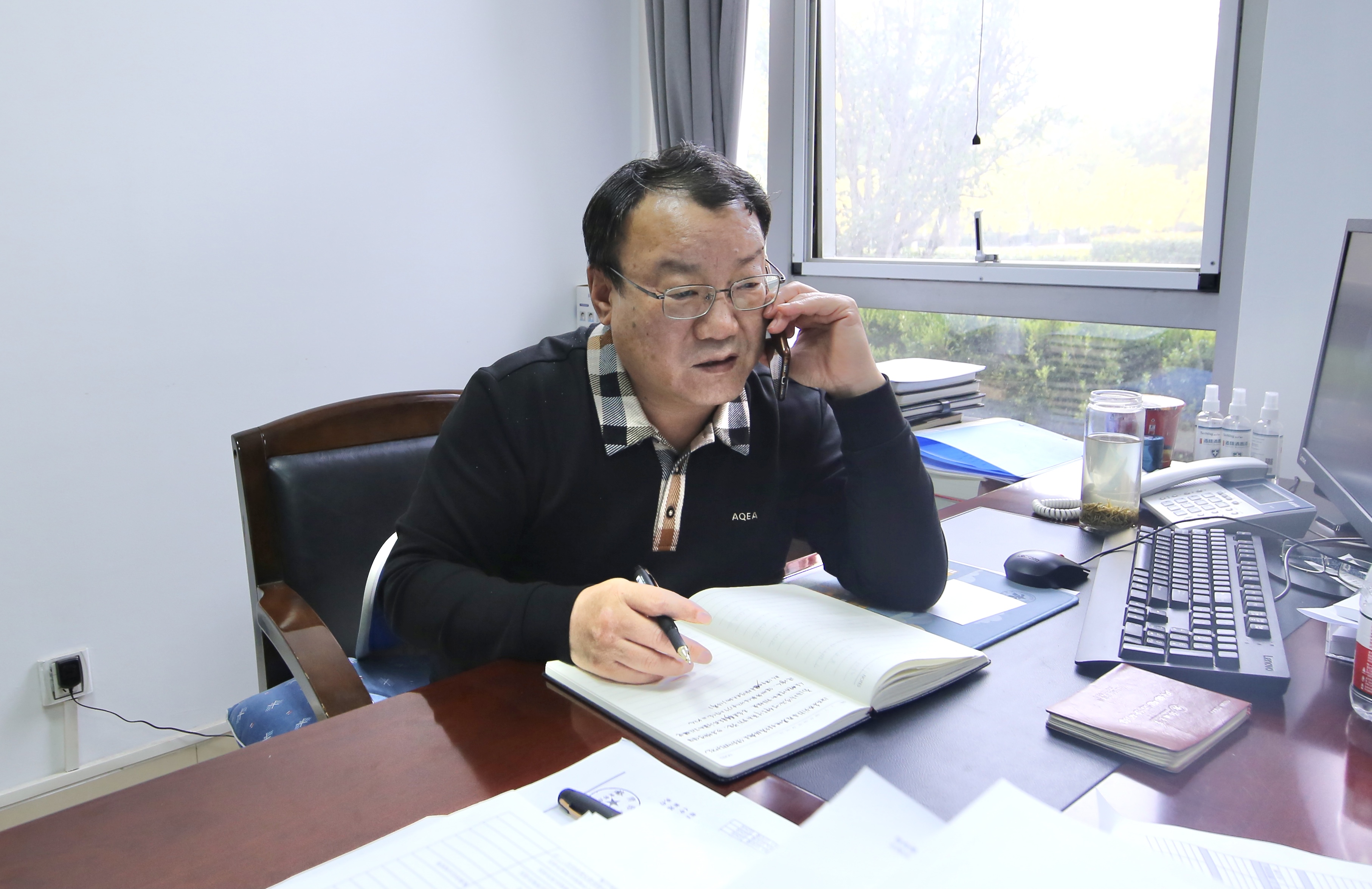 办公室主任孙建华正一手拿着座机沟通处理工作,一边在手机上查找文件和身边的工作人员进行交接,“他工作起来就是这样,基本上两个电话没断过线。没日没夜连轴转,高血压又反复突发,在办公室已经晕倒两次了,谁都劝不走。大家都说孙主任的血压就是学校疫情防控的‘晴雨表’。”提及孙主任,办公室的一位工作人员说。