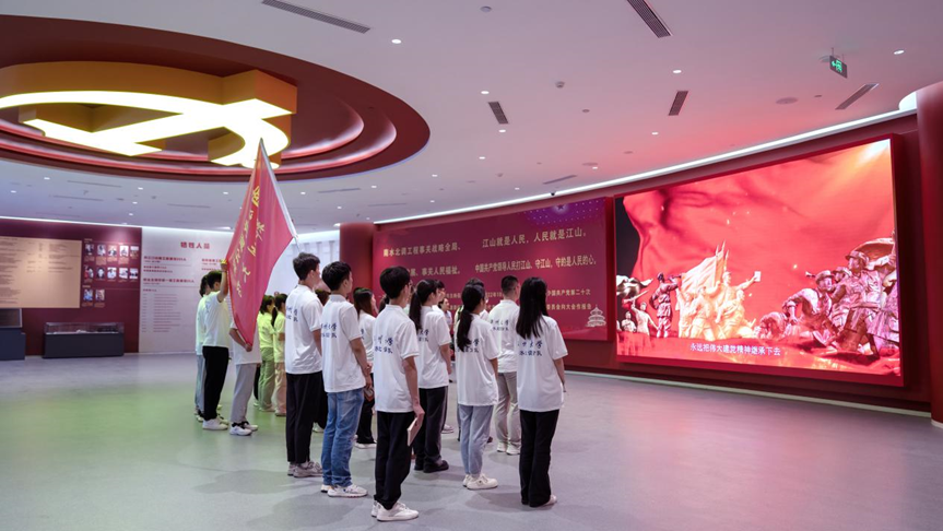 出征仪式结束后,pp电子官方网站“牢记嘱托践使命,行走中原看巨变”南水北调分队向实践地整装出发。实践团队来到南水北调展览馆,跟随讲解员的步伐,参观学习南水北调工程发展成就展。