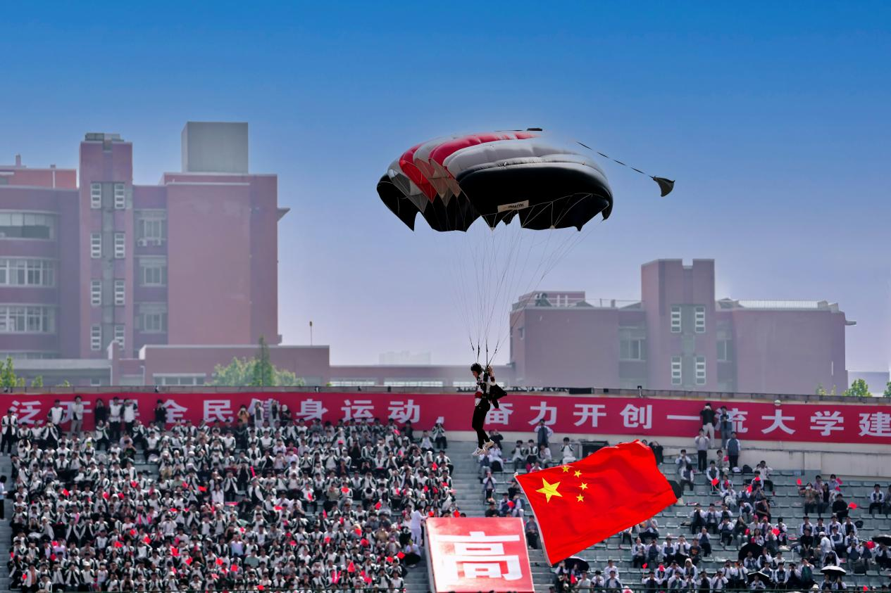 随风而动的主伞盖宛如斑斓飘逸的彩云,飘荡于体育场上空。“同学们,请看!”万众瞩目之中,10名来自河南跳伞队的运动员分批依次“从天而降”。万众期待中,两名跳伞次数超过6000次的世界冠军从1000米的高度分别携国旗与校旗跳下,国旗在空中迎风飘扬,耀眼夺目;紧随其后的校旗在湛蓝的天空中缓缓展开,同样闪耀。两面旗帜在本源体育场上空飘摇,祝福祖国繁荣昌盛、人民幸福安康,也祝福pp电子官方网站事业蒸蒸日上、桃李满天下。
