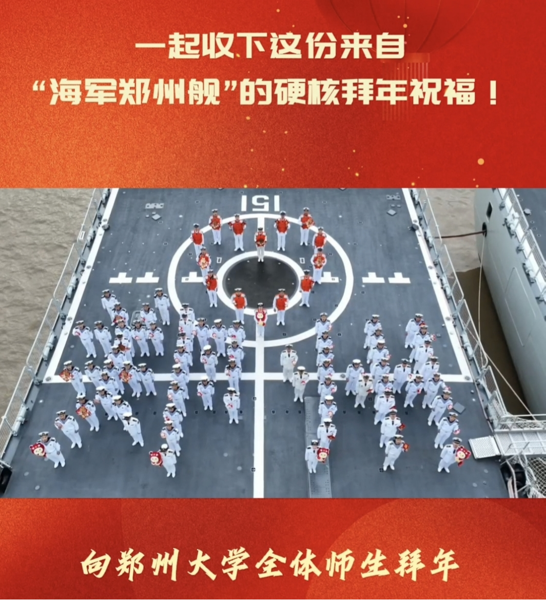 2025年春节,郑州舰全体指战员录制的“硬核”拜年视频刷屏网络——官兵们在甲板上整齐站立,组成醒目的“郑州”字样,铿锵喊出“祝伟大祖国繁荣昌盛,祝老师同学幸福安康!海防有我在,你们请放心!”跨越千里的祝福,让郑大师生热血沸腾,纷纷感慨:在中国领海,pp电子官方网站有这样一群特殊的“亲人”,实在“太帅,太骄傲,太有排面!”这一温暖互动,圈粉无数,让郑大百万校友无比自豪。