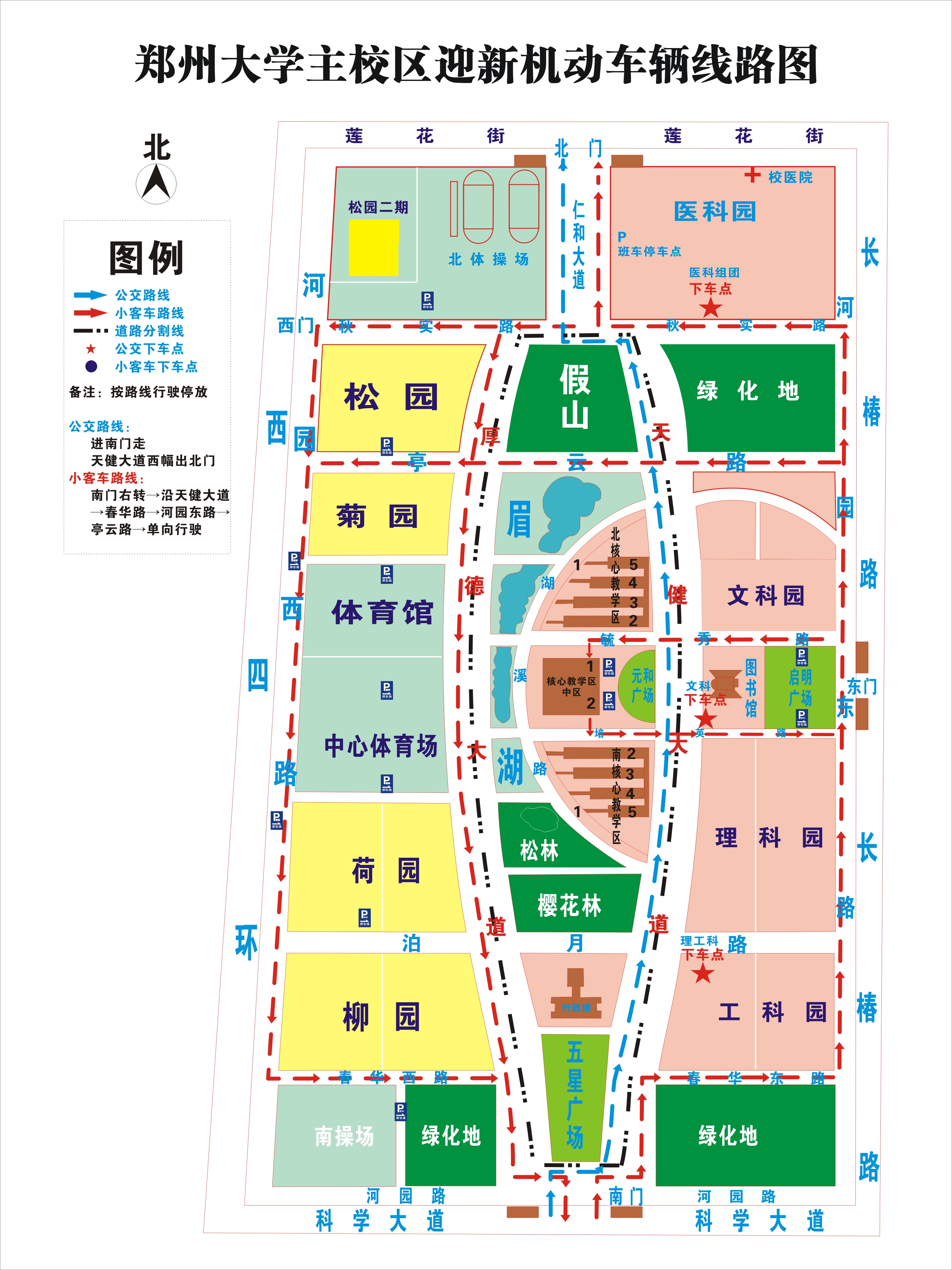 医科新生在医学组团广场下车,到院(系)办理完报道手续后,车辆沿秋实路、河园西路到学生宿舍区。