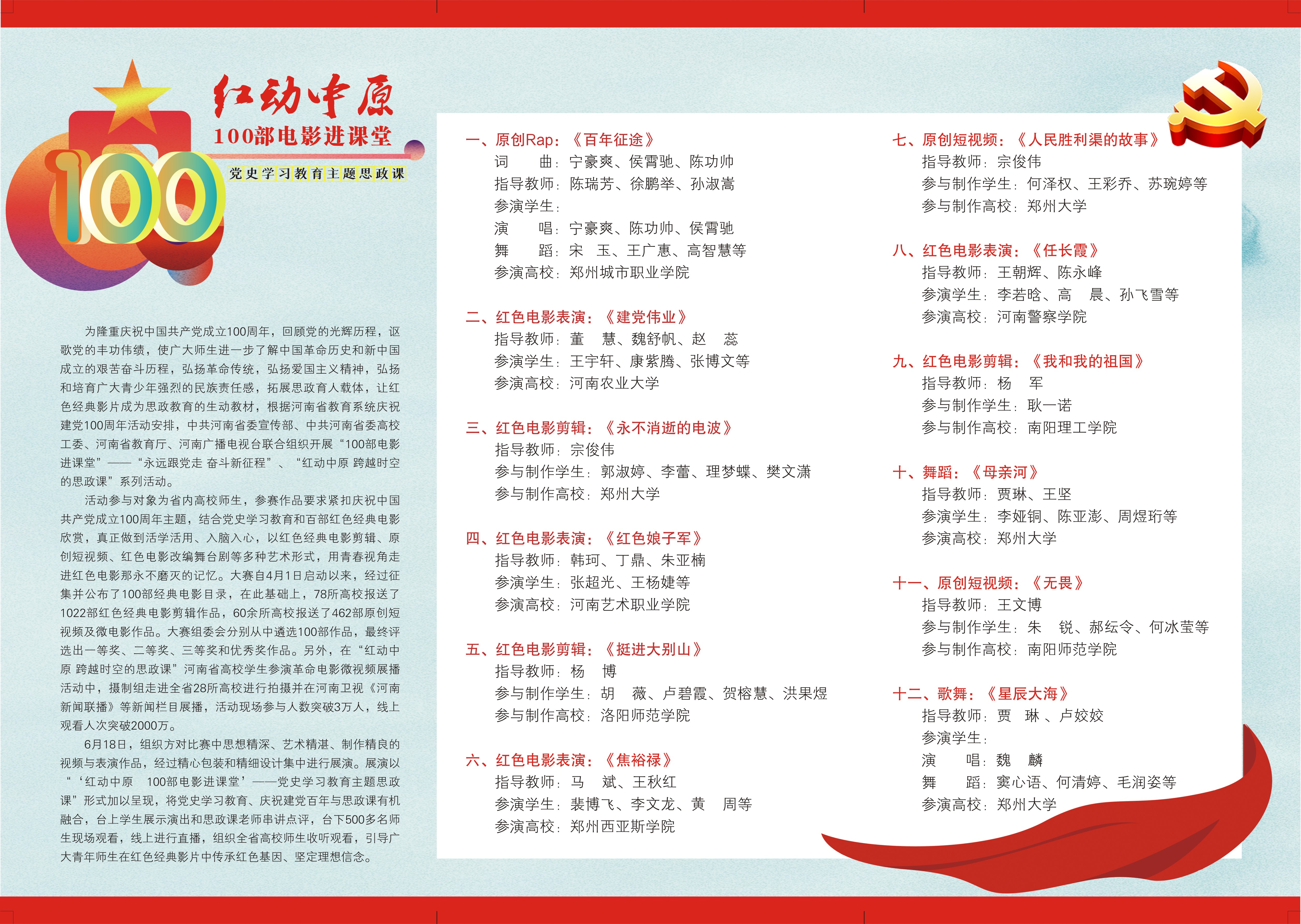 为庆祝中国共产党成立100周年,推动党史学习教育入脑入心,拓展思政育人载体,由省委宣传部、省委高校工委、省教育厅、河南广播电视台主办,pp电子官方网站等单位承办的“红动中原·100部电影进课堂”党史学习教育主题思政课将于今晚(6月18日)19:00-21:00在南校区学习堂举行。