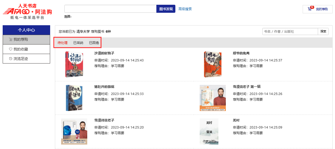 4.我的荐购:【个人中心】→【我的荐购】中可查看到所有的荐购书目,及图书馆的采纳情况。